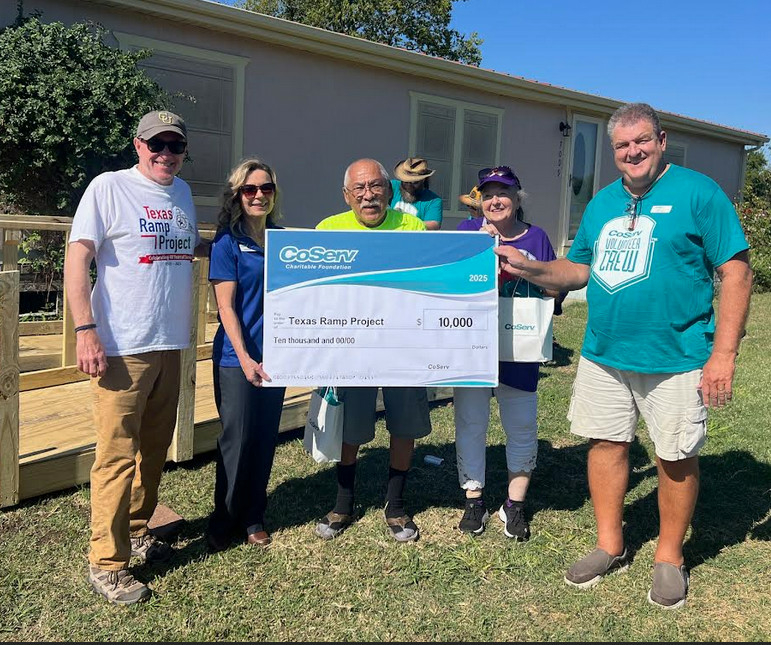 For the past 10 years, CoServ, one the state’s largest power and energy providers, has been an ardent supporter of the Texas Ramp Project, both in providing volunteer construction teams to build wheelchair ramps (volunteering their time and at no cost) for their neighbors in need, but also providing much need funding via generous donations from the CoServ Charitable Foundation to pay for the materials needed for these much-needed ramps.